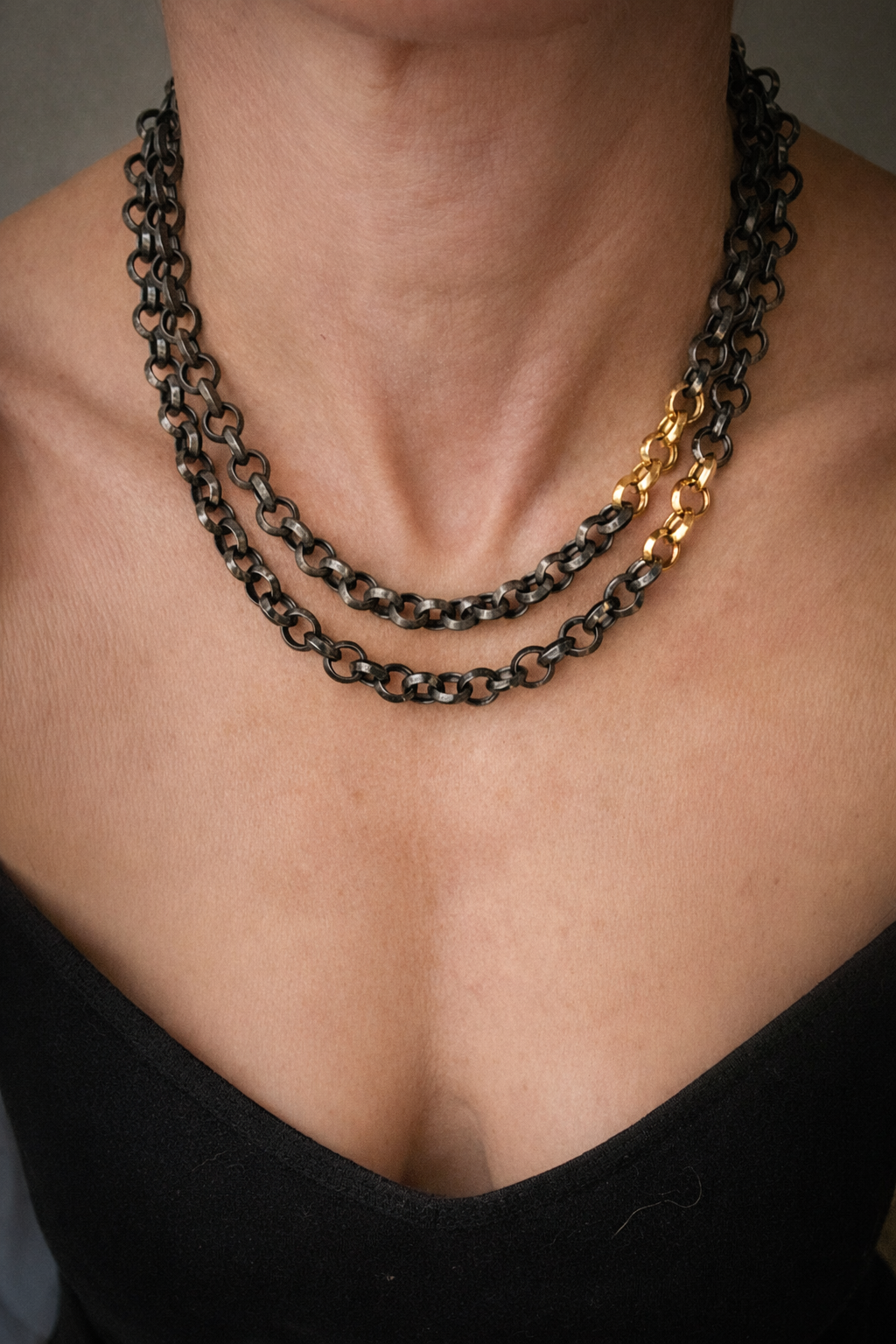 Oxidized Sterling Silver Custom Link Chain with 18k Yellow Gold Link